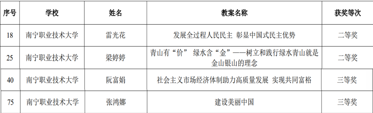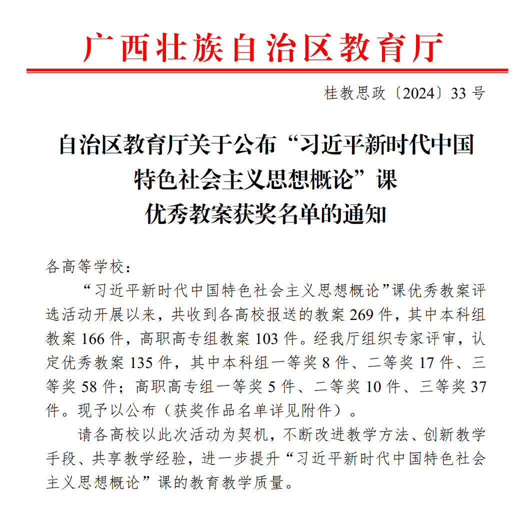 近日,自治区教育厅公布了2024年广西高校“习近平新时代中国特色社会主义思想概论”课优秀教案评选活动结果,公司思政课教师雷光花、梁婷婷分别荣获本科组二等奖,阮富娟、张鸿娜分别荣获本科组三等奖。